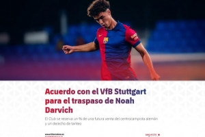 体育资讯7月1日讯 巴萨官方消息,B队18岁中场诺亚-达维希转会加盟斯图加特,巴萨在协议中保留了这位德国中场的未来转会分成比例以及优先回购权。