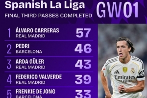 体育资讯8月21日讯 西甲首轮战罢,Squawka统计球员在进攻三区完成传球次数,A费57次居首,佩德里、居勒尔分列二三位。