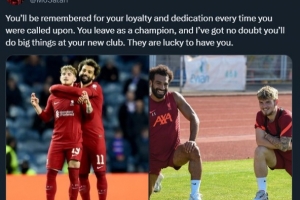 萨拉赫写道:“你的忠诚和每一次上场所表现出来的投入将会被铭记,你作为一个冠军离开,我毫不怀疑你会在新东家成就伟大事业,拥有你是他们的幸运。”