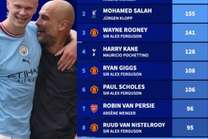 德转盘点同一主帅治下球员进球榜:亨利175球居首,萨拉赫155球