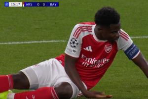 体育资讯11月27日讯 阿森纳vs拜仁第16分钟,诺伊尔出击解围,萨卡鼻子被撞出血,队医进场处理!