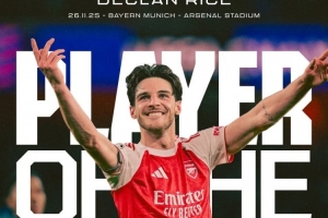 体育资讯11月27日讯 欧冠联赛阶段第5轮比赛,赖斯踢满全场,帮助阿森纳主场3-1击败拜仁。