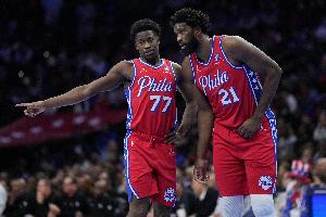 此前,76人先发为:马克西、埃奇库姆、乔治、巴洛、恩比德。