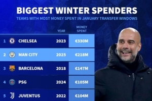 体育资讯2月4日讯 2025年五大联赛冬季转会窗关闭,德转列出了单个冬窗引援最高花销榜单,今年的曼城花费2.18亿欧元排名历史第二。